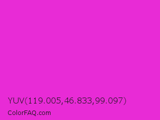 YUV 119.005,46.833,99.097 Color is a normal magenta color and the nearest color is Razzle Dazzle Rose #ff33cc. Hex code #e82bd6 and RGB value is rgb(232,43,214). In RGB color space, this color is composed of 91% red, 17% green, 84% blue, In CMYK color space, this color is composed of 0% cyan, 81% magenta, 8% yellow , 9% black , In HSL color space, this color has a hue angle of 306° , 80% saturation and 54% lightness.