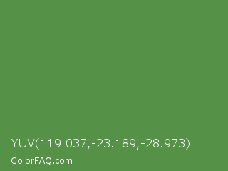 YUV 119.037,-23.189,-28.973 Color is a normal green color and the nearest color is May Green #4c9141. Hex code #569148 and RGB value is rgb(86,145,72). In RGB color space, this color is composed of 34% red, 57% green, 28% blue, In CMYK color space, this color is composed of 41% cyan, 0% magenta, 50% yellow , 43% black , In HSL color space, this color has a hue angle of 108° , 34% saturation and 43% lightness.