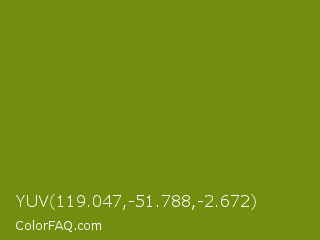 YUV 119.047,-51.788,-2.672 Color is a dark lime color and the nearest color is Trendy Green #7c881a. Hex code #748d0e and RGB value is rgb(116,141,14). In RGB color space, this color is composed of 45% red, 55% green, 5% blue, In CMYK color space, this color is composed of 18% cyan, 0% magenta, 90% yellow , 45% black , In HSL color space, this color has a hue angle of 72° , 82% saturation and 30% lightness.