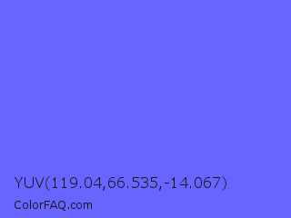 YUV 119.04,66.535,-14.067 Color is a light indigo color and the nearest color is Very Light Blue #6666ff. Hex code #6765fe and RGB value is rgb(103,101,254). In RGB color space, this color is composed of 40% red, 40% green, 100% blue, In CMYK color space, this color is composed of 59% cyan, 60% magenta, 0% yellow , 0% black , In HSL color space, this color has a hue angle of 241° , 99% saturation and 70% lightness.