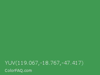 YUV 119.067,-18.767,-47.417 Color is a normal green color and the nearest color is Fruit Salad #4f9d5d. Hex code #419a51 and RGB value is rgb(65,154,81). In RGB color space, this color is composed of 25% red, 60% green, 32% blue, In CMYK color space, this color is composed of 58% cyan, 0% magenta, 47% yellow , 40% black , In HSL color space, this color has a hue angle of 131° , 41% saturation and 43% lightness.