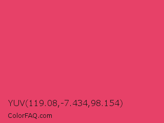 YUV 119.08,-7.434,98.154 Color is a normal red color and the nearest color is Paradise Pink #e63e62. Hex code #e74168 and RGB value is rgb(231,65,104). In RGB color space, this color is composed of 91% red, 25% green, 41% blue, In CMYK color space, this color is composed of 0% cyan, 72% magenta, 55% yellow , 9% black , In HSL color space, this color has a hue angle of 346° , 78% saturation and 58% lightness.