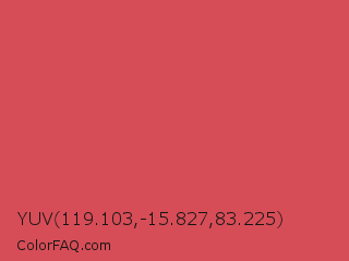 YUV 119.103,-15.827,83.225 Color is a normal red color and the nearest color is Dark Terra Cotta #cc4e5c. Hex code #d64d57 and RGB value is rgb(214,77,87). In RGB color space, this color is composed of 84% red, 30% green, 34% blue, In CMYK color space, this color is composed of 0% cyan, 64% magenta, 59% yellow , 16% black , In HSL color space, this color has a hue angle of 356° , 63% saturation and 57% lightness.