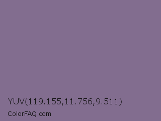 YUV 119.155,11.756,9.511 Color is a normal purple color and the nearest color is Mobster #7f7589. Hex code #826d8f and RGB value is rgb(130,109,143). In RGB color space, this color is composed of 51% red, 43% green, 56% blue, In CMYK color space, this color is composed of 9% cyan, 24% magenta, 0% yellow , 44% black , In HSL color space, this color has a hue angle of 277° , 13% saturation and 49% lightness.