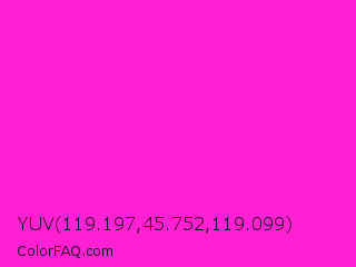 YUV 119.197,45.752,119.099 Color is a normal magenta color and the nearest color is Hot Magenta #ff1dce. Hex code #ff20d4 and RGB value is rgb(255,32,212). In RGB color space, this color is composed of 100% red, 13% green, 83% blue, In CMYK color space, this color is composed of 0% cyan, 87% magenta, 17% yellow , 0% black , In HSL color space, this color has a hue angle of 312° , 100% saturation and 56% lightness.