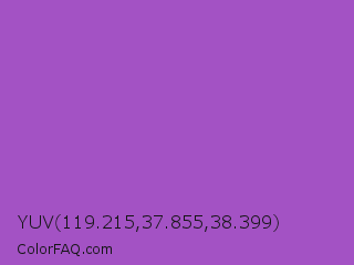 YUV 119.215,37.855,38.399 Color is a normal purple color and the nearest color is Deep Lilac #9955bb. Hex code #a352c4 and RGB value is rgb(163,82,196). In RGB color space, this color is composed of 64% red, 32% green, 77% blue, In CMYK color space, this color is composed of 17% cyan, 58% magenta, 0% yellow , 23% black , In HSL color space, this color has a hue angle of 283° , 49% saturation and 55% lightness.