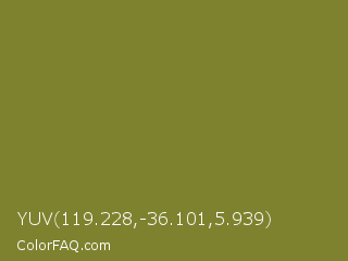 YUV 119.228,-36.101,5.939 Color is a normal yellow color and the nearest color is Old Moss Green #867e36. Hex code #7e822e and RGB value is rgb(126,130,46). In RGB color space, this color is composed of 49% red, 51% green, 18% blue, In CMYK color space, this color is composed of 3% cyan, 0% magenta, 65% yellow , 49% black , In HSL color space, this color has a hue angle of 63° , 48% saturation and 35% lightness.