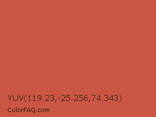 YUV 119.23,-25.256,74.343 Color is a normal red color and the nearest color is Dark Coral #cd5b45. Hex code #cc5644 and RGB value is rgb(204,86,68). In RGB color space, this color is composed of 80% red, 34% green, 27% blue, In CMYK color space, this color is composed of 0% cyan, 58% magenta, 67% yellow , 20% black , In HSL color space, this color has a hue angle of 8° , 57% saturation and 53% lightness.