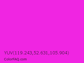 YUV 119.243,52.631,105.904 Color is a normal magenta color and the nearest color is Hot Magenta #ff1dce. Hex code #f025e2 and RGB value is rgb(240,37,226). In RGB color space, this color is composed of 94% red, 15% green, 89% blue, In CMYK color space, this color is composed of 0% cyan, 85% magenta, 6% yellow , 6% black , In HSL color space, this color has a hue angle of 304° , 87% saturation and 54% lightness.