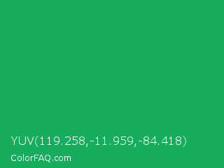 YUV 119.258,-11.959,-84.418 Color is a normal green color and the nearest color is GO Green #00ab66. Hex code #17ad5f and RGB value is rgb(23,173,95). In RGB color space, this color is composed of 9% red, 68% green, 37% blue, In CMYK color space, this color is composed of 87% cyan, 0% magenta, 45% yellow , 32% black , In HSL color space, this color has a hue angle of 149° , 77% saturation and 38% lightness.
