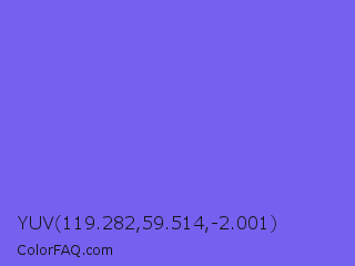 YUV 119.282,59.514,-2.001 Color is a light indigo color and the nearest color is Medium Slate Blue #7b68ee. Hex code #7561f0 and RGB value is rgb(117,97,240). In RGB color space, this color is composed of 46% red, 38% green, 94% blue, In CMYK color space, this color is composed of 51% cyan, 60% magenta, 0% yellow , 6% black , In HSL color space, this color has a hue angle of 248° , 83% saturation and 66% lightness.