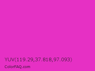 YUV 119.29,37.818,97.093 Color is a normal magenta color and the nearest color is Razzle Dazzle Rose #ff33cc. Hex code #e630c4 and RGB value is rgb(230,48,196). In RGB color space, this color is composed of 90% red, 19% green, 77% blue, In CMYK color space, this color is composed of 0% cyan, 79% magenta, 15% yellow , 10% black , In HSL color space, this color has a hue angle of 311° , 78% saturation and 55% lightness.