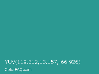 YUV 119.312,13.157,-66.926 Color is a normal cyan color and the nearest color is Lochinvar #2c8c84. Hex code #2b9992 and RGB value is rgb(43,153,146). In RGB color space, this color is composed of 17% red, 60% green, 57% blue, In CMYK color space, this color is composed of 72% cyan, 0% magenta, 5% yellow , 40% black , In HSL color space, this color has a hue angle of 176° , 56% saturation and 38% lightness.