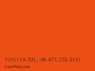 YUV 119.331,-48.477,102.319 Color is a normal orange color and the nearest color is Orioles Orange #fb4f14. Hex code #ec4f15 and RGB value is rgb(236,79,21). In RGB color space, this color is composed of 93% red, 31% green, 8% blue, In CMYK color space, this color is composed of 0% cyan, 67% magenta, 91% yellow , 7% black , In HSL color space, this color has a hue angle of 16° , 85% saturation and 50% lightness.