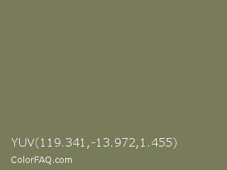 YUV 119.341,-13.972,1.455 Color is a normal yellow color and the nearest color is Limed Ash #747d63. Hex code #797c5b and RGB value is rgb(121,124,91). In RGB color space, this color is composed of 47% red, 49% green, 36% blue, In CMYK color space, this color is composed of 2% cyan, 0% magenta, 27% yellow , 51% black , In HSL color space, this color has a hue angle of 65° , 15% saturation and 42% lightness.