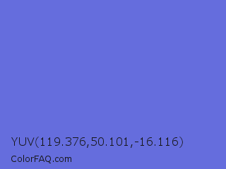 YUV 119.376,50.101,-16.116 Color is a light blue color and the nearest color is Slate Blue #6a5acd. Hex code #656ddd and RGB value is rgb(101,109,221). In RGB color space, this color is composed of 40% red, 43% green, 87% blue, In CMYK color space, this color is composed of 54% cyan, 51% magenta, 0% yellow , 13% black , In HSL color space, this color has a hue angle of 236° , 64% saturation and 63% lightness.