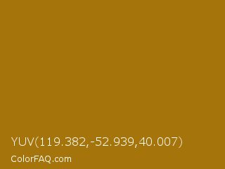 YUV 119.382,-52.939,40.007 Color is a normal orange color and the nearest color is Buttered Rum #a1750d. Hex code #a5750c and RGB value is rgb(165,117,12). In RGB color space, this color is composed of 65% red, 46% green, 5% blue, In CMYK color space, this color is composed of 0% cyan, 29% magenta, 93% yellow , 35% black , In HSL color space, this color has a hue angle of 41° , 86% saturation and 35% lightness.