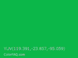 YUV 119.391,-23.857,-95.059 Color is a normal green color and the nearest color is Dark Pastel Green #03c03c. Hex code #0bb847 and RGB value is rgb(11,184,71). In RGB color space, this color is composed of 4% red, 72% green, 28% blue, In CMYK color space, this color is composed of 94% cyan, 0% magenta, 61% yellow , 28% black , In HSL color space, this color has a hue angle of 141° , 89% saturation and 38% lightness.