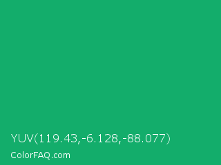 YUV 119.43,-6.128,-88.077 Color is a normal green color and the nearest color is Green Crayola #1cac78. Hex code #13ad6b and RGB value is rgb(19,173,107). In RGB color space, this color is composed of 7% red, 68% green, 42% blue, In CMYK color space, this color is composed of 89% cyan, 0% magenta, 38% yellow , 32% black , In HSL color space, this color has a hue angle of 154° , 80% saturation and 38% lightness.