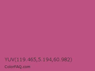 YUV 119.465,5.194,60.982 Color is a normal rose color and the nearest color is Mulberry #c54b8c. Hex code #bd5282 and RGB value is rgb(189,82,130). In RGB color space, this color is composed of 74% red, 32% green, 51% blue, In CMYK color space, this color is composed of 0% cyan, 57% magenta, 31% yellow , 26% black , In HSL color space, this color has a hue angle of 333° , 45% saturation and 53% lightness.