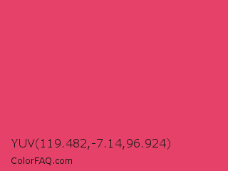 YUV 119.482,-7.14,96.924 Color is a normal red color and the nearest color is Paradise Pink #e63e62. Hex code #e64269 and RGB value is rgb(230,66,105). In RGB color space, this color is composed of 90% red, 26% green, 41% blue, In CMYK color space, this color is composed of 0% cyan, 71% magenta, 54% yellow , 10% black , In HSL color space, this color has a hue angle of 346° , 77% saturation and 58% lightness.