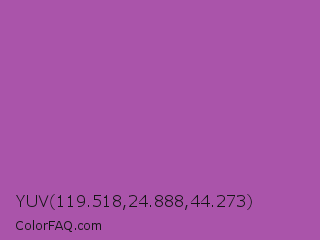 YUV 119.518,24.888,44.273 Color is a normal magenta color and the nearest color is Purpureus #9a4eae. Hex code #aa54aa and RGB value is rgb(170,84,170). In RGB color space, this color is composed of 67% red, 33% green, 67% blue, In CMYK color space, this color is composed of 0% cyan, 51% magenta, 0% yellow , 33% black , In HSL color space, this color has a hue angle of 300° , 34% saturation and 50% lightness.