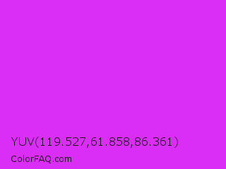 YUV 119.527,61.858,86.361 Color is a normal magenta color and the nearest color is Steel Pink #cc33cc. Hex code #da2df5 and RGB value is rgb(218,45,245). In RGB color space, this color is composed of 85% red, 18% green, 96% blue, In CMYK color space, this color is composed of 11% cyan, 82% magenta, 0% yellow , 4% black , In HSL color space, this color has a hue angle of 292° , 91% saturation and 57% lightness.
