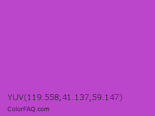YUV 119.558,41.137,59.147 Color is a normal magenta color and the nearest color is Medium Orchid #ba55d3. Hex code #bb45cb and RGB value is rgb(187,69,203). In RGB color space, this color is composed of 73% red, 27% green, 80% blue, In CMYK color space, this color is composed of 8% cyan, 66% magenta, 0% yellow , 20% black , In HSL color space, this color has a hue angle of 293° , 56% saturation and 53% lightness.