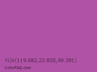 YUV 119.682,22.835,49.391 Color is a normal magenta color and the nearest color is Pearly Purple #b768a2. Hex code #b052a6 and RGB value is rgb(176,82,166). In RGB color space, this color is composed of 69% red, 32% green, 65% blue, In CMYK color space, this color is composed of 0% cyan, 53% magenta, 6% yellow , 31% black , In HSL color space, this color has a hue angle of 306° , 37% saturation and 51% lightness.