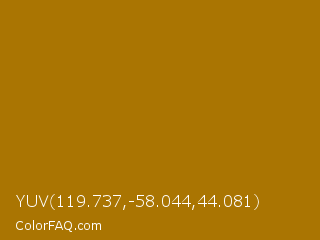 YUV 119.737,-58.044,44.081 Color is a normal orange color and the nearest color is Buttered Rum #a1750d. Hex code #aa7502 and RGB value is rgb(170,117,2). In RGB color space, this color is composed of 67% red, 46% green, 1% blue, In CMYK color space, this color is composed of 0% cyan, 31% magenta, 99% yellow , 33% black , In HSL color space, this color has a hue angle of 41° , 98% saturation and 34% lightness.