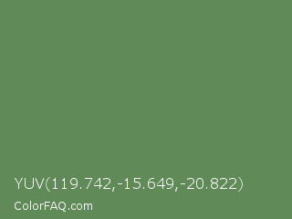 YUV 119.742,-15.649,-20.822 Color is a normal green color and the nearest color is Glade Green #61845f. Hex code #608a58 and RGB value is rgb(96,138,88). In RGB color space, this color is composed of 38% red, 54% green, 35% blue, In CMYK color space, this color is composed of 30% cyan, 0% magenta, 36% yellow , 46% black , In HSL color space, this color has a hue angle of 110° , 22% saturation and 44% lightness.