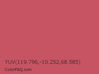 YUV 119.796,-10.252,68.585 Color is a normal red color and the nearest color is Popstar #be4f62. Hex code #c65463 and RGB value is rgb(198,84,99). In RGB color space, this color is composed of 78% red, 33% green, 39% blue, In CMYK color space, this color is composed of 0% cyan, 58% magenta, 50% yellow , 22% black , In HSL color space, this color has a hue angle of 352° , 50% saturation and 55% lightness.