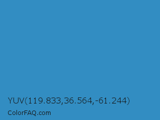 YUV 119.833,36.564,-61.244 Color is a normal blue color and the nearest color is Boston Blue #3b91b4. Hex code #328dc2 and RGB value is rgb(50,141,194). In RGB color space, this color is composed of 20% red, 55% green, 76% blue, In CMYK color space, this color is composed of 74% cyan, 27% magenta, 0% yellow , 24% black , In HSL color space, this color has a hue angle of 202° , 59% saturation and 48% lightness.