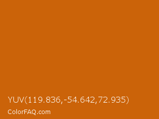 YUV 119.836,-54.642,72.935 Color is a normal orange color and the nearest color is Red Stage #d05f04. Hex code #cb6309 and RGB value is rgb(203,99,9). In RGB color space, this color is composed of 80% red, 39% green, 4% blue, In CMYK color space, this color is composed of 0% cyan, 51% magenta, 96% yellow , 20% black , In HSL color space, this color has a hue angle of 28° , 92% saturation and 42% lightness.