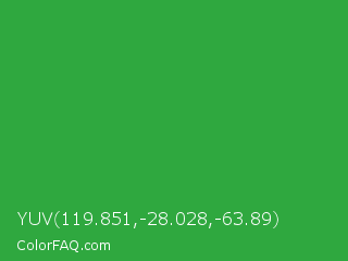 YUV 119.851,-28.028,-63.89 Color is a normal green color and the nearest color is Wageningen Green #34b233. Hex code #2fa83f and RGB value is rgb(47,168,63). In RGB color space, this color is composed of 18% red, 66% green, 25% blue, In CMYK color space, this color is composed of 72% cyan, 0% magenta, 63% yellow , 34% black , In HSL color space, this color has a hue angle of 128° , 56% saturation and 42% lightness.