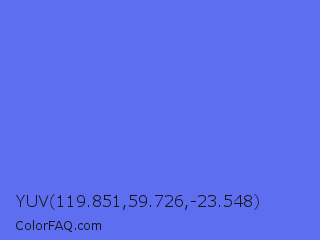 YUV 119.851,59.726,-23.548 Color is a light blue color and the nearest color is Very Light Blue #6666ff. Hex code #5d6ef1 and RGB value is rgb(93,110,241). In RGB color space, this color is composed of 36% red, 43% green, 95% blue, In CMYK color space, this color is composed of 61% cyan, 54% magenta, 0% yellow , 5% black , In HSL color space, this color has a hue angle of 233° , 84% saturation and 65% lightness.