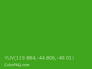 YUV 119.884,-44.806,-49.01 Color is a normal green color and the nearest color is Kelly Green #4cbb17. Hex code #40a61d and RGB value is rgb(64,166,29). In RGB color space, this color is composed of 25% red, 65% green, 11% blue, In CMYK color space, this color is composed of 61% cyan, 0% magenta, 83% yellow , 35% black , In HSL color space, this color has a hue angle of 105° , 70% saturation and 38% lightness.