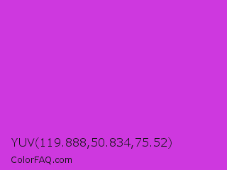 YUV 119.888,50.834,75.52 Color is a normal magenta color and the nearest color is Steel Pink #cc33cc. Hex code #ce38df and RGB value is rgb(206,56,223). In RGB color space, this color is composed of 81% red, 22% green, 87% blue, In CMYK color space, this color is composed of 8% cyan, 75% magenta, 0% yellow , 13% black , In HSL color space, this color has a hue angle of 294° , 72% saturation and 55% lightness.