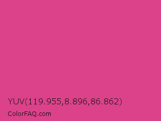 YUV 119.955,8.896,86.862 Color is a normal rose color and the nearest color is Pink Pantone #d74894. Hex code #db428a and RGB value is rgb(219,66,138). In RGB color space, this color is composed of 86% red, 26% green, 54% blue, In CMYK color space, this color is composed of 0% cyan, 70% magenta, 37% yellow , 14% black , In HSL color space, this color has a hue angle of 332° , 68% saturation and 56% lightness.
