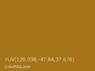 YUV 120.038,-47.84,37.678 Color is a normal orange color and the nearest color is Buttered Rum #a1750d. Hex code #a37517 and RGB value is rgb(163,117,23). In RGB color space, this color is composed of 64% red, 46% green, 9% blue, In CMYK color space, this color is composed of 0% cyan, 28% magenta, 86% yellow , 36% black , In HSL color space, this color has a hue angle of 40° , 75% saturation and 36% lightness.