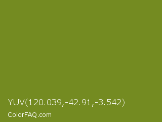 YUV 120.039,-42.91,-3.542 Color is a normal lime color and the nearest color is Wasabi #788a25. Hex code #748b21 and RGB value is rgb(116,139,33). In RGB color space, this color is composed of 45% red, 55% green, 13% blue, In CMYK color space, this color is composed of 17% cyan, 0% magenta, 76% yellow , 45% black , In HSL color space, this color has a hue angle of 73° , 62% saturation and 34% lightness.