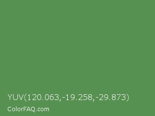 YUV 120.063,-19.258,-29.873 Color is a normal green color and the nearest color is Middle Green #4d8c57. Hex code #569151 and RGB value is rgb(86,145,81). In RGB color space, this color is composed of 34% red, 57% green, 32% blue, In CMYK color space, this color is composed of 41% cyan, 0% magenta, 44% yellow , 43% black , In HSL color space, this color has a hue angle of 115° , 28% saturation and 44% lightness.