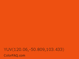 YUV 120.06,-50.809,103.433 Color is a normal orange color and the nearest color is Orioles Orange #fb4f14. Hex code #ee5011 and RGB value is rgb(238,80,17). In RGB color space, this color is composed of 93% red, 31% green, 7% blue, In CMYK color space, this color is composed of 0% cyan, 66% magenta, 93% yellow , 7% black , In HSL color space, this color has a hue angle of 17° , 87% saturation and 50% lightness.