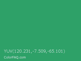 YUV 120.231,-7.509,-65.101 Color is a normal green color and the nearest color is Chateau Green #40a860. Hex code #2ea169 and RGB value is rgb(46,161,105). In RGB color space, this color is composed of 18% red, 63% green, 41% blue, In CMYK color space, this color is composed of 71% cyan, 0% magenta, 35% yellow , 37% black , In HSL color space, this color has a hue angle of 151° , 56% saturation and 41% lightness.