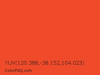 YUV 120.388,-38.152,104.023 Color is a normal red color and the nearest color is Pomegranate #f34723. Hex code #ef4b2b and RGB value is rgb(239,75,43). In RGB color space, this color is composed of 94% red, 29% green, 17% blue, In CMYK color space, this color is composed of 0% cyan, 69% magenta, 82% yellow , 6% black , In HSL color space, this color has a hue angle of 10° , 86% saturation and 55% lightness.