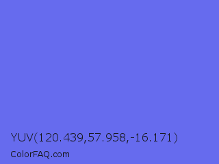 YUV 120.439,57.958,-16.171 Color is a light blue color and the nearest color is Very Light Blue #6666ff. Hex code #666bee and RGB value is rgb(102,107,238). In RGB color space, this color is composed of 40% red, 42% green, 93% blue, In CMYK color space, this color is composed of 57% cyan, 55% magenta, 0% yellow , 7% black , In HSL color space, this color has a hue angle of 238° , 80% saturation and 67% lightness.