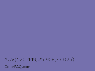 YUV 120.449,25.908,-3.025 Color is a normal indigo color and the nearest color is Deluge #7563a8. Hex code #7570ad and RGB value is rgb(117,112,173). In RGB color space, this color is composed of 46% red, 44% green, 68% blue, In CMYK color space, this color is composed of 32% cyan, 35% magenta, 0% yellow , 32% black , In HSL color space, this color has a hue angle of 245° , 27% saturation and 56% lightness.