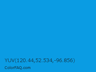 YUV 120.44,52.534,-96.856 Color is a normal blue color and the nearest color is Cerulean #02a4d3. Hex code #0a9ce3 and RGB value is rgb(10,156,227). In RGB color space, this color is composed of 4% red, 61% green, 89% blue, In CMYK color space, this color is composed of 96% cyan, 31% magenta, 0% yellow , 11% black , In HSL color space, this color has a hue angle of 200° , 92% saturation and 46% lightness.