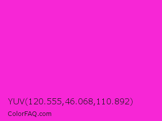 YUV 120.555,46.068,110.892 Color is a normal magenta color and the nearest color is Hot Magenta #ff1dce. Hex code #f726d6 and RGB value is rgb(247,38,214). In RGB color space, this color is composed of 97% red, 15% green, 84% blue, In CMYK color space, this color is composed of 0% cyan, 85% magenta, 13% yellow , 3% black , In HSL color space, this color has a hue angle of 309° , 93% saturation and 56% lightness.