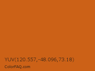 YUV 120.557,-48.096,73.18 Color is a normal orange color and the nearest color is Alloy Orange #c46210. Hex code #cc6117 and RGB value is rgb(204,97,23). In RGB color space, this color is composed of 80% red, 38% green, 9% blue, In CMYK color space, this color is composed of 0% cyan, 52% magenta, 89% yellow , 20% black , In HSL color space, this color has a hue angle of 25° , 80% saturation and 45% lightness.